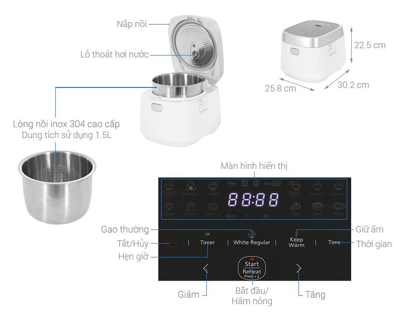 Nồi được trang bị chức năng hẹn giờ nấu lên đến 24 giờ, giúp bạn dễ dàng chuẩn bị bữa ăn từ trước và có cơm sẵn khi cần. Ngoài ra, chế độ giữ ấm đến 5 giờ giữ cho cơm luôn nóng hổi, mềm ẩm như vừa nấu xong. Hệ thống làm mát thông minh ngăn quá nhiệt, đảm bảo cơm không bị khô hay cháy cạnh.