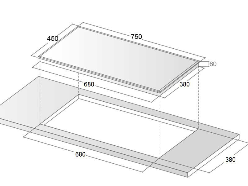 • Bếp đôi: 2 vùng từ Mặt kính Schott Ceran, vát 4 cạnh, bo góc