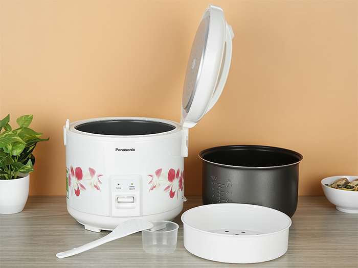 Nồi cơm điện Panasonic 1,8 lít SR MVN18FRAX sở hữu thiết kế khá đơn giản nhưng không kém phần sang trọng. Nồi có gam màu trắng chủ đạo, điểm thêm một vài họa tiết hoa xinh xắn nên luôn nổi bật và phù hợp cho nhiều không gian bếp.