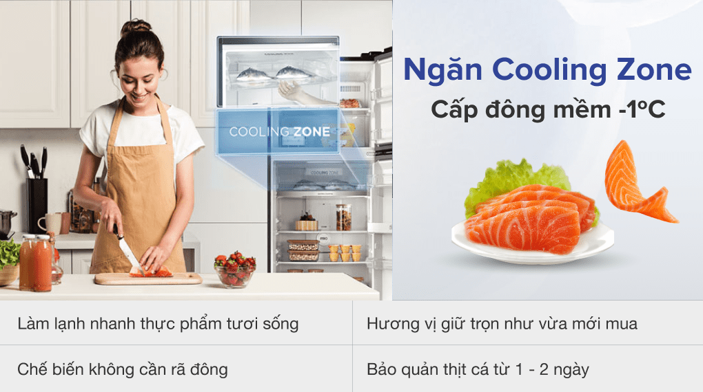 Ngăn lạnh nhanh Cooling Zone có thể giúp thực phẩm tươi sống như thịt cá giữ được chất dinh dưỡng trọn vẹn và chống ôi thiu từ 1 - 2 ngày, đáp ứng nhu cầu chế biến thực phẩm ngay lập tức mà không cần phải rã đông.