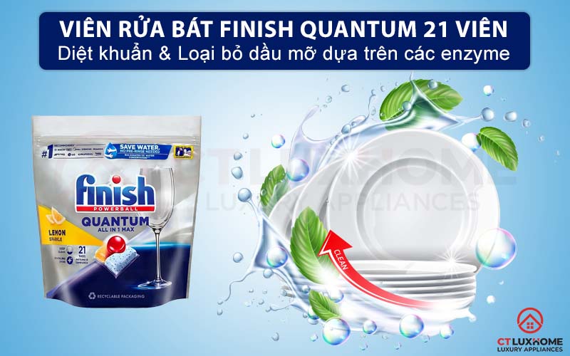 Viên rửa bát Finish Quantum 21 viên là sản phẩm cao cấp của thương hiệu Finish, được thiết kế để cung cấp hiệu quả vượt trội trong việc làm sạch và bảo vệ bát đũa. Dưới đây là công dụng và chức năng chính của sản phẩm này: